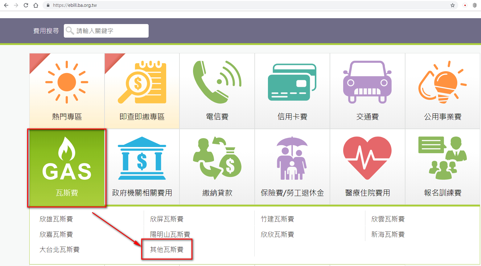 進入網頁後,請點選『瓦斯費』按鈕,再點選『其他瓦斯費』進入繳費網頁。