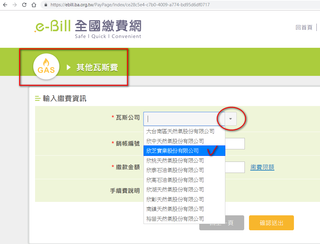 再畫面點選瓦斯公司下拉選單,挑選『欣芝實業股份有限公司』,再在銷帳編號中輸入瓦斯繳費通知單上的第二段條碼數字,再在繳款金額中輸入瓦斯繳費通知單上的應繳總金額,再按『確認送出』按鈕,進行金融卡授權繳費。