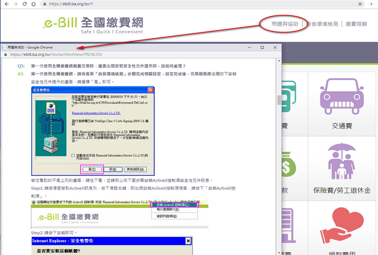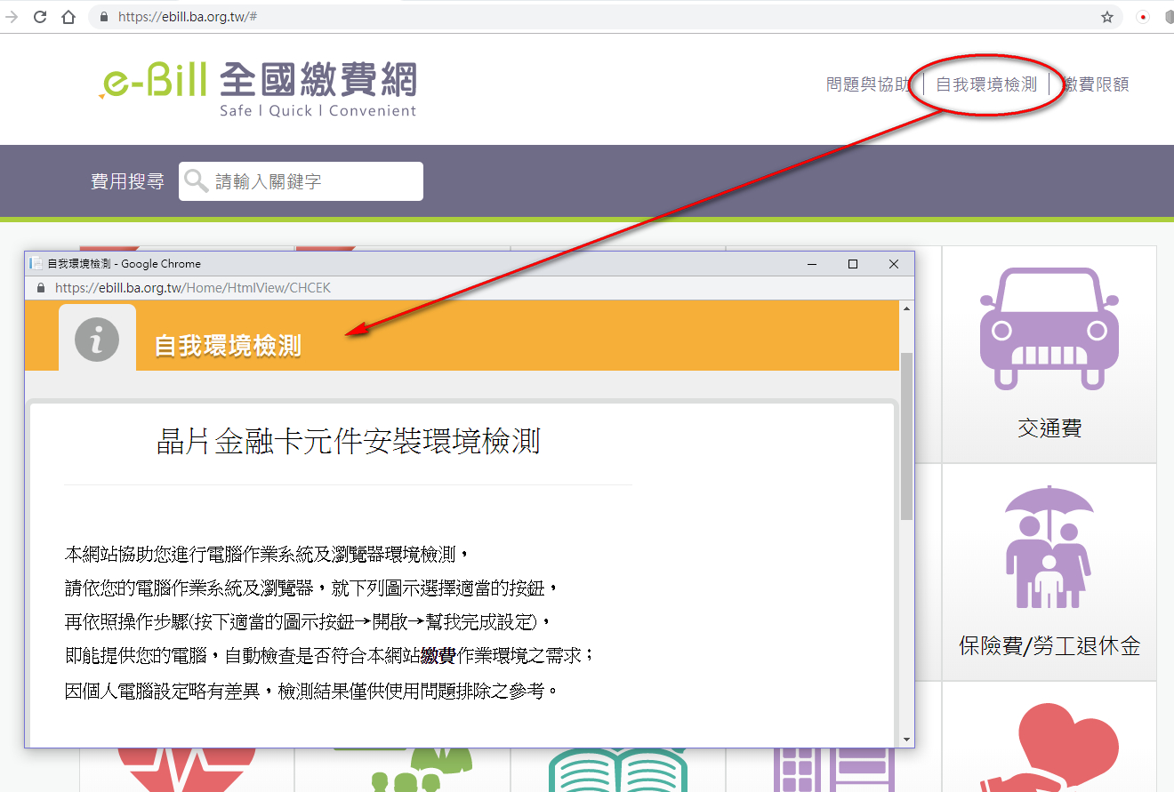 初次使用全國繳費網繳費,請您先按網頁右上角『自我環境檢測』檢查您電腦是否符合繳費網站的使用需求,以及是否安裝『安控元件』。