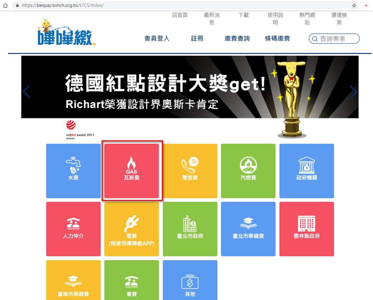 進入網頁後,請點選『瓦斯費』按鈕進入繳費網頁。