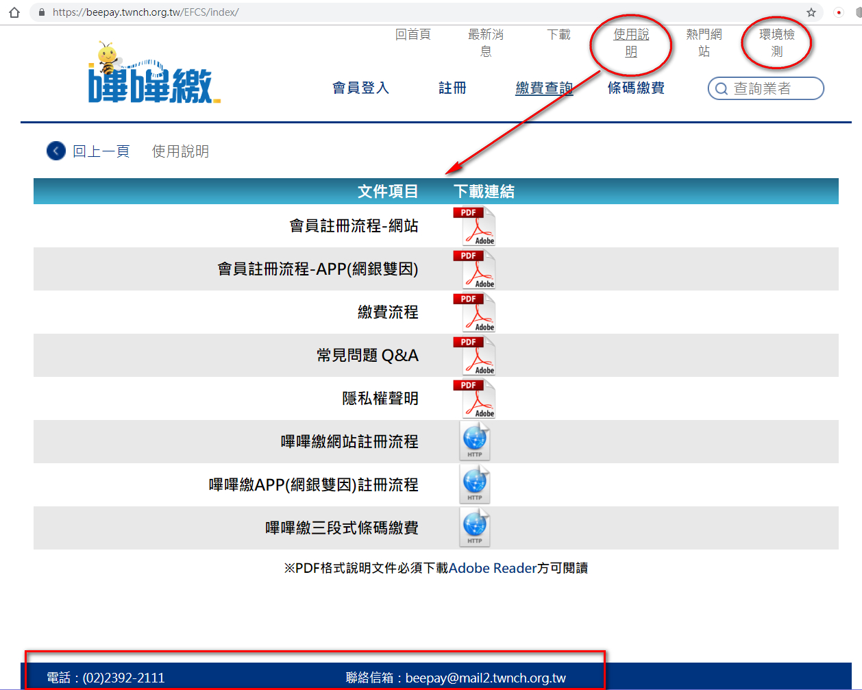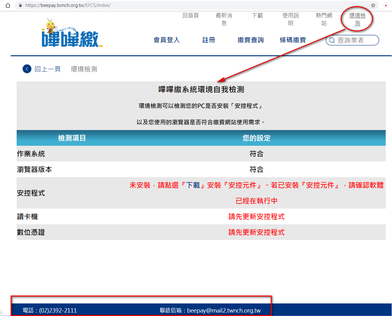 初次使用嗶嗶繳網頁繳費,請您先按網頁右上角『環境檢測』檢查您電腦是否符合繳費網站的使用需求,以及是否安裝『安控元件』。