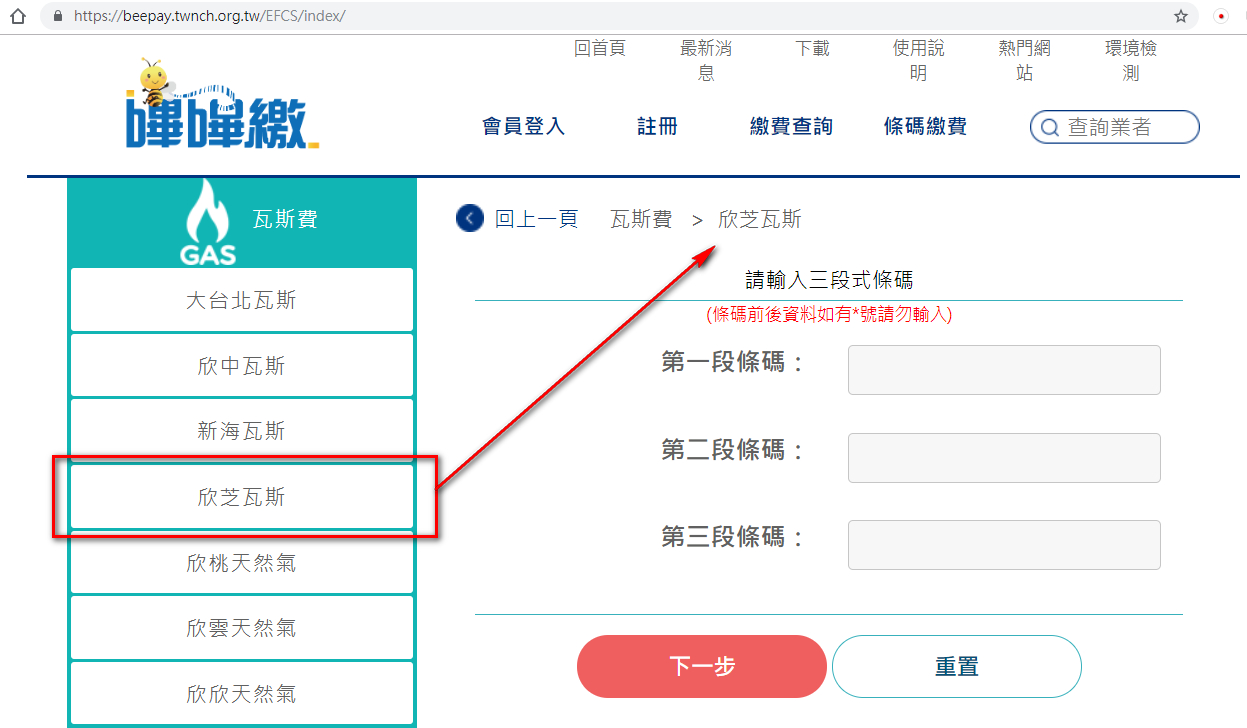 再點選左邊選單中的『欣芝瓦斯』,再右邊畫面中依序輸入瓦斯繳費通知單上面三段條碼數字,再按『下一步』按鈕,進行金融卡授權繳費。